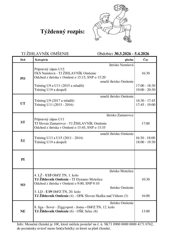 Týždenný rozpis tréningov a zápasov TJ Žihlavník Omšenie